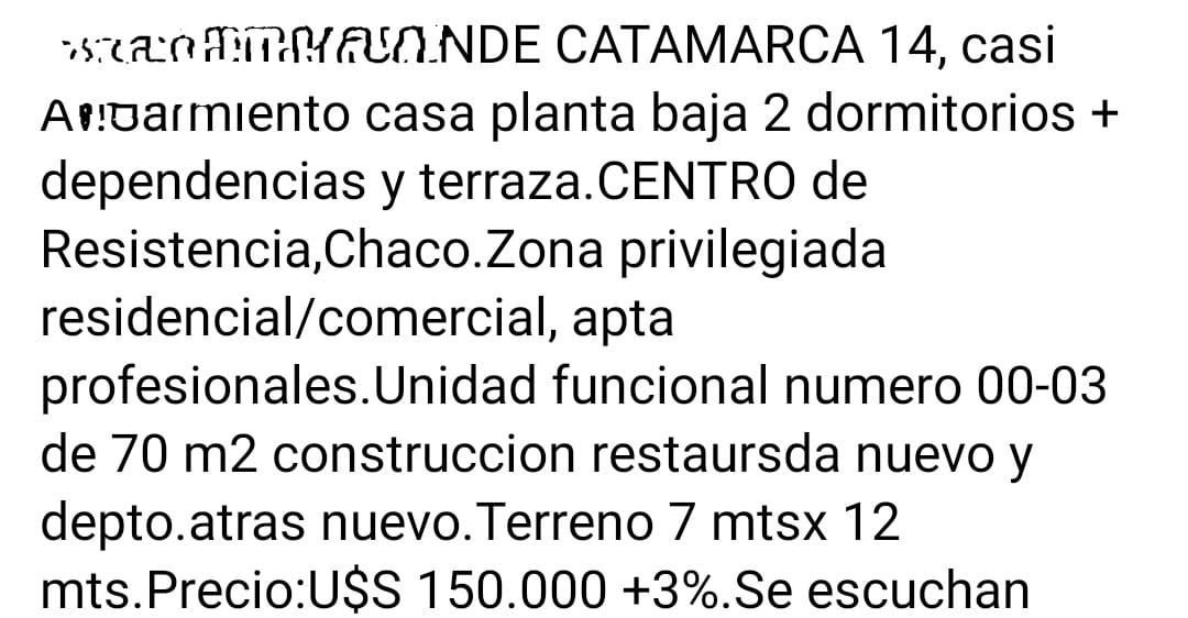 Casa planta baja 2 Habitaciones + pleno centro de resistencia + dependencias y terraza, zona privilegiada residencia/comercio, apta profecionales. Unidad funcional numero 00-03 de 70 m2 construccion restaurada nueva y depto. atras nuevo. Terreno 7 mtsx 12.